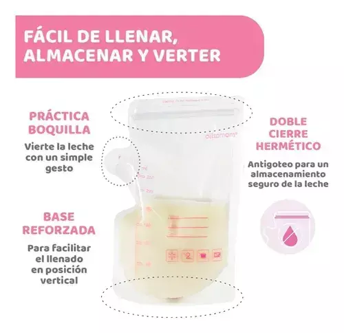 o Calentamiento: Vierte directamente la leche de la bolsa en una mamadera y caliéntala.