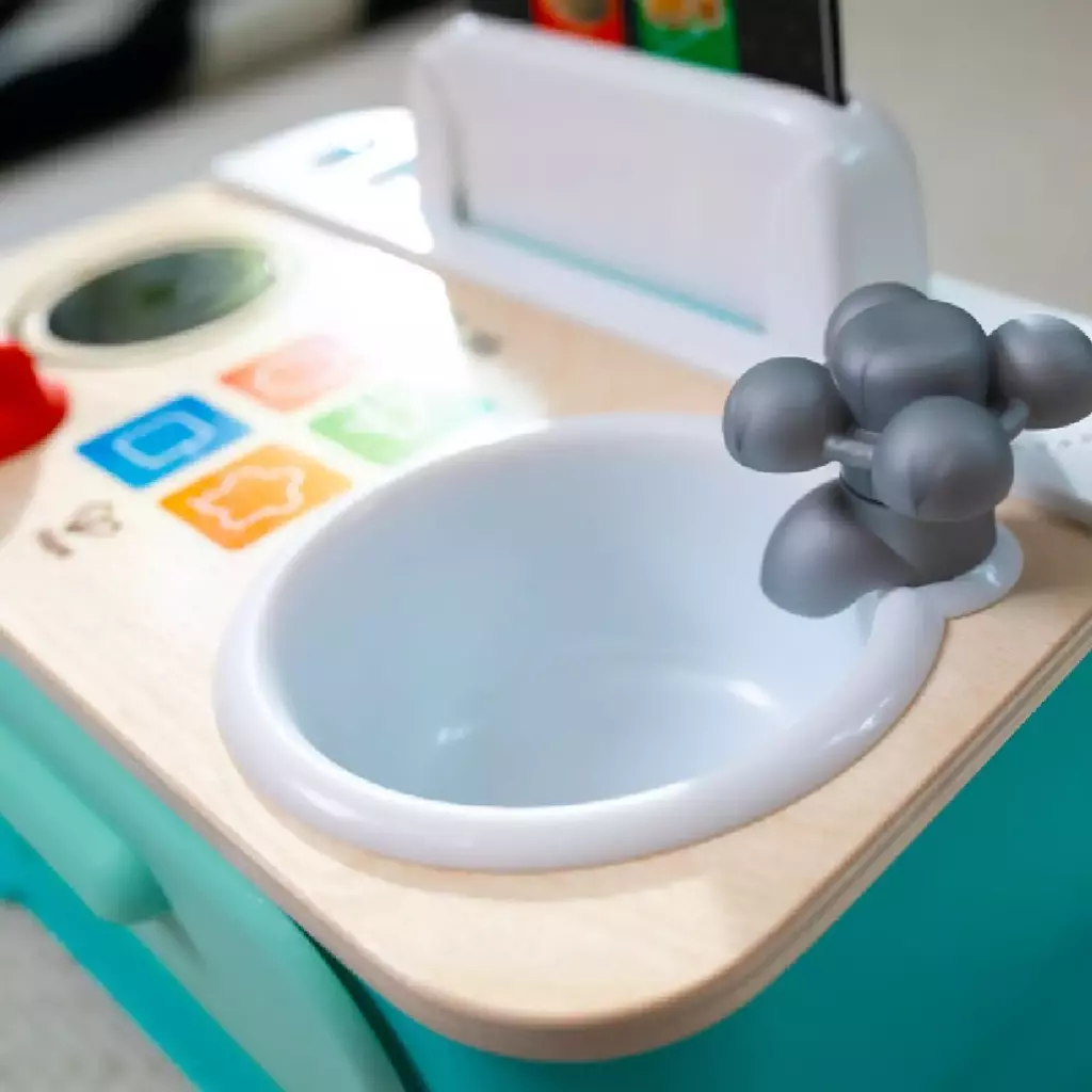 El modo de juego anima a los bebés a explorar mientras giran las perillas del grifo y de la estufa, tocan los 4 botones Magic Touch y abren la estufa para activar luces, sonidos de cocina y música.