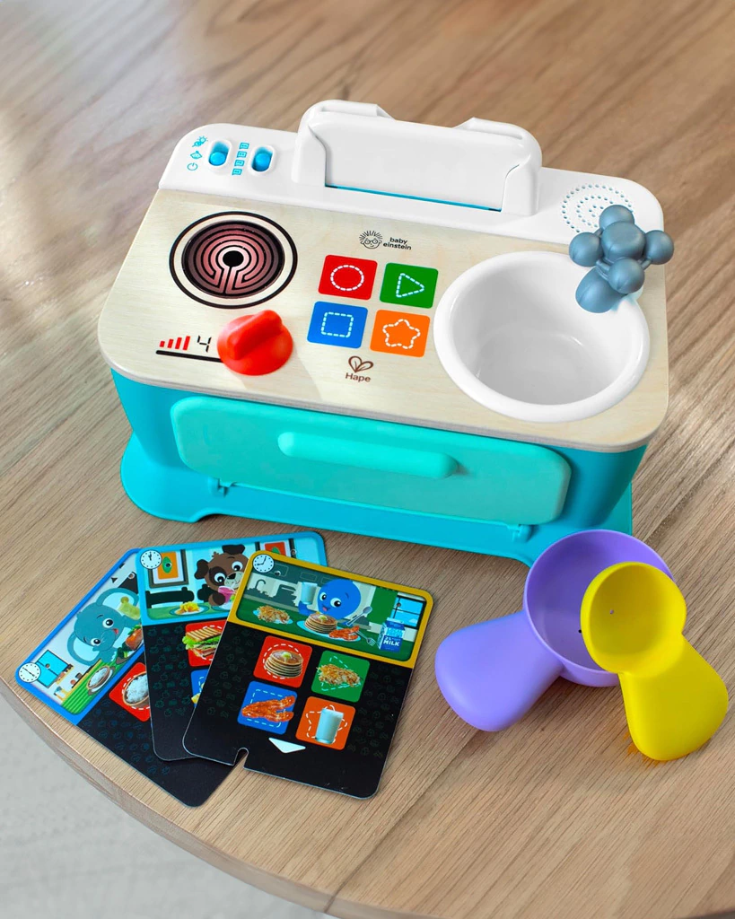 Ayuda al bebé a aprender conceptos del mundo real como alimentos, colores y formas con la cocina Magic Touch de Baby Einstein + Hape. Con madera certificada FSC, esta colorida cocina de juguete cuenta con horno, fregadero y estufa para ayudar al bebé a imitar la cocina.