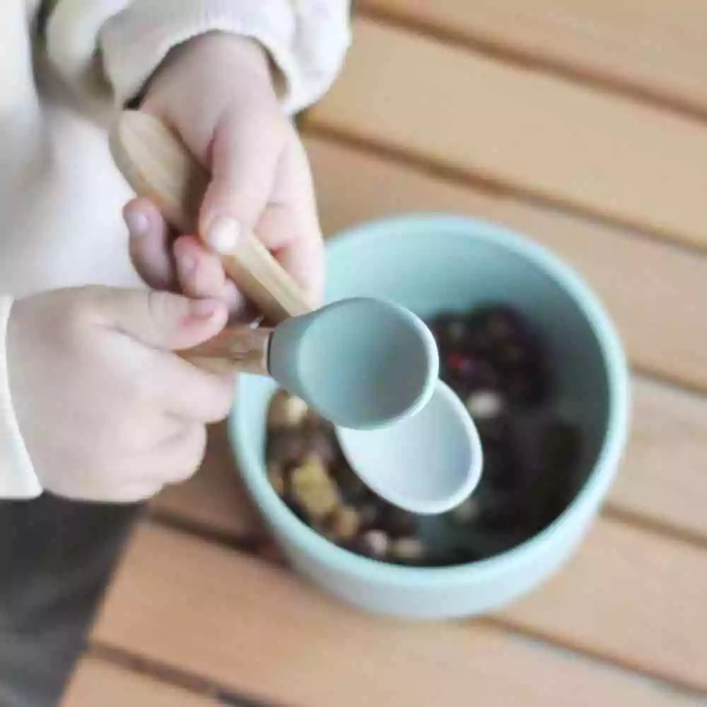 Ayuda al desarrollo de las habilidades motoras adecuadas. La cuchara de silicona suave es suave para las encías de la dentición. El mango de bambú natural 100% ecológico es biodegradable. Lavar a mano cada pieza por separado con agua jabonosa tibia. Alternativa saludable al plástico. Edad: 6+ meses.