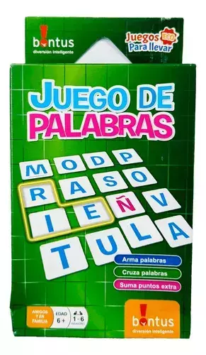 48 fichas de letras, un talonario "palabras"; hojas de anotación de puntos e instrucciones de los juegos: Juego de palabras, Cruzando palabras y Palabra larga.