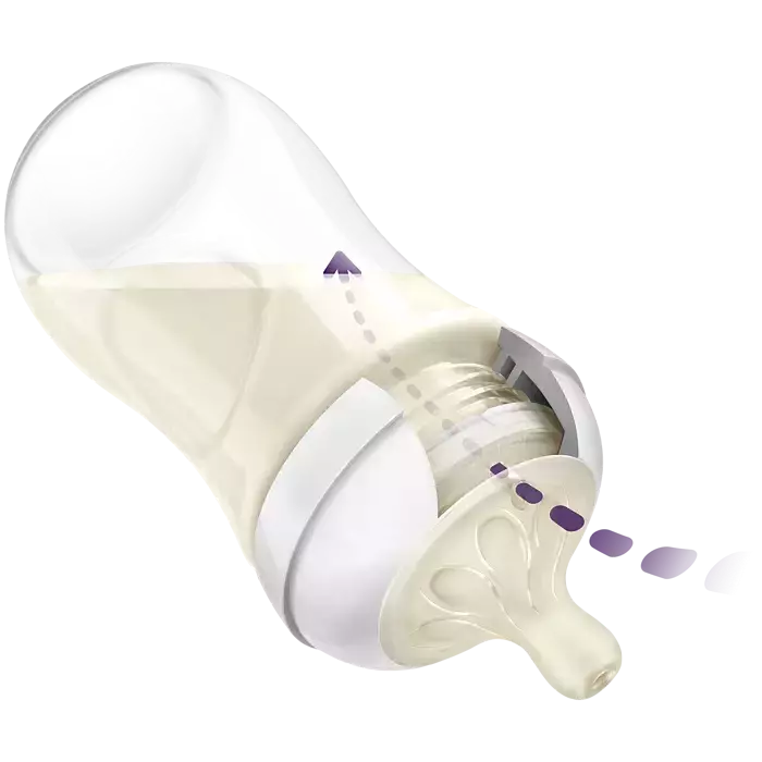 La válvula anticólicos ayuda a reducir los cólicos y malestares manteniendo el aire alejado del estómago del bebé mientras se alimenta. Además, la tetina está disponible en una variedad de flujos para adaptarse al ritmo y necesidades de alimentación de cada bebé.