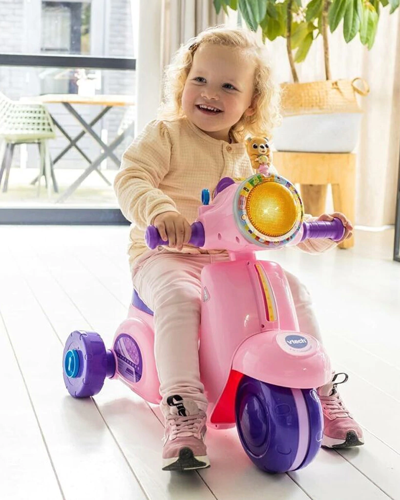 Divertida moto interactiva 3 en 1 con modo andador y montador. Incluye diferentes elementos para manipular, canciones y melodías. Enseña números y colores.