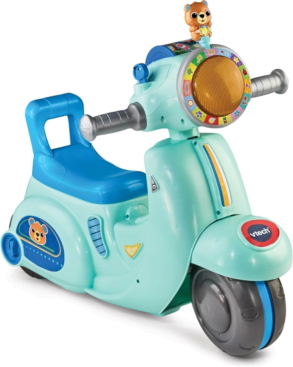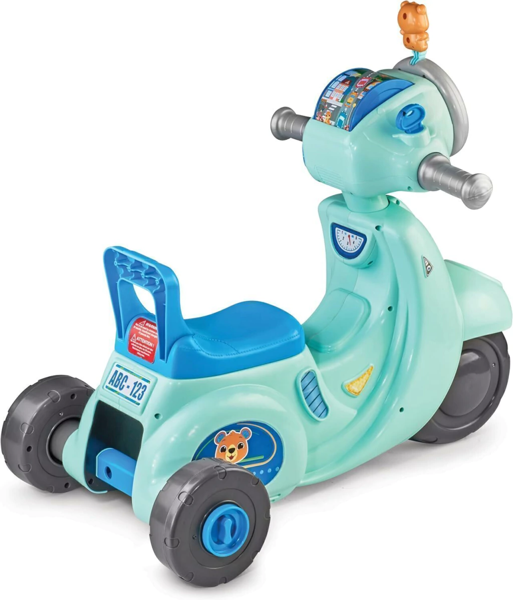 Divertida moto interactiva 3 en 1 con modo andador y montador. Incluye diferentes elementos para manipular, canciones y melodías. Enseña números y colores.