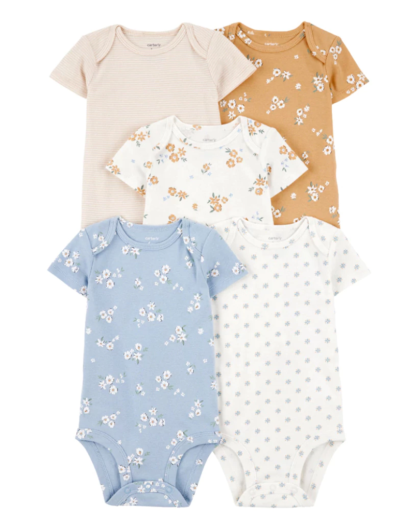 Confeccionados en suave algodón, este pack de 5 bodies es perfecto para tu bebé.