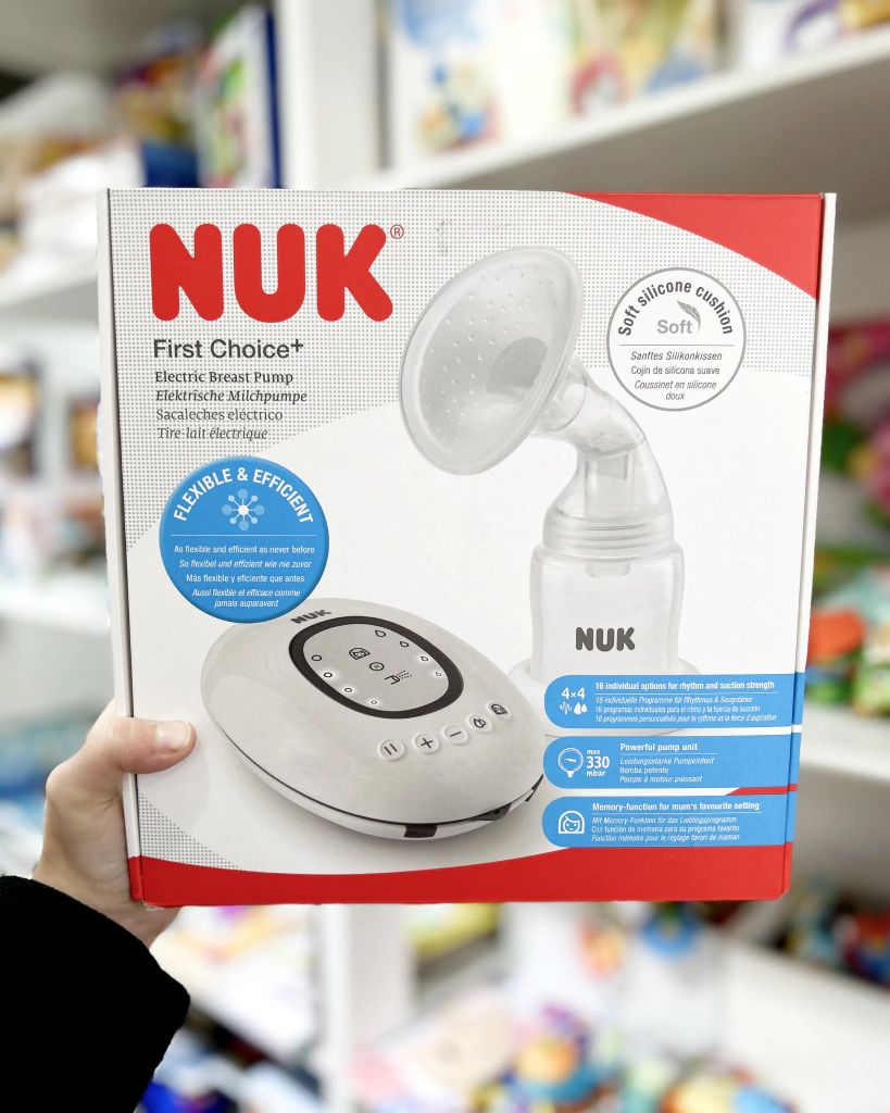 El Sacaleche NUK First Choice+ incluye un contenedor para leche materna 150ml, tetina 0-6m de flujo S, rosca, tapa sellante, tapa, soporte, cable USB y adaptador de red.