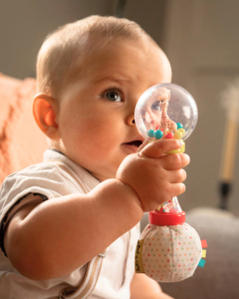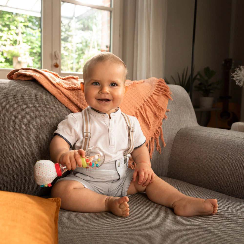 El bebé puede agitarlo para ver y oír el ruido de las bolas multicolores.